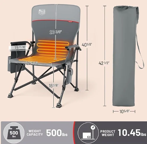 Kerusi lipat yang dipanaskan adat, zon pemanasan ganda untuk belakang dan tempat duduk panas sehingga 131 ° F dalam hanya 10 saat. Tiga tetapan haba (104 ° F, 122 ° F, 131 ° F) memberikan kehangatan untuk sebarang majlis luar (bateri tidak termasuk).