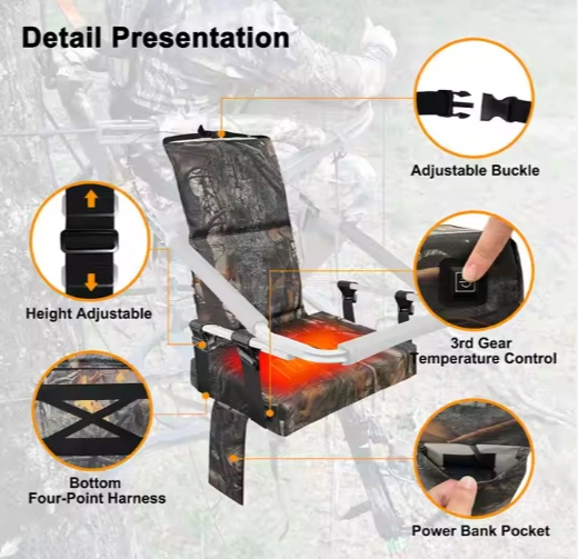 Kerusi yang dipanaskan memancing di luar, menawarkan kekuatan dan keselesaan, dan direka untuk menahan keadaan luaran yang lasak sambil memberikan sokongan tempat duduk yang kuat, memastikan memburu selesa selama berjam -jam