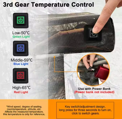 Pakej yang dipanaskan memancing di luar. Pakej tidak termasuk bank kuasa; Selain itu, bunyi bisingnya yang lembut mengurangkan buih yang lembut memastikan gangguan yang minimum, menawarkan pengalaman memburu yang lancar. memastikan memburu selesa selama berjam -jam