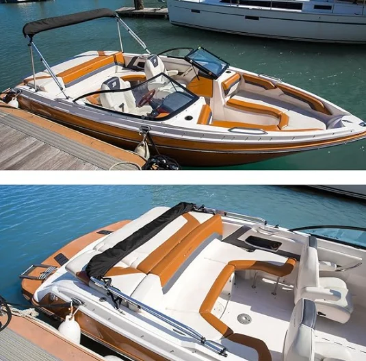 Kapal Stainless Bimini atas, diperbuat daripada kanvas poliester gred 600D marin dengan salutan PU berganda, boot penyimpanan kami memberikan perlindungan yang baik dari cahaya matahari, air laut, hujan dan debu.